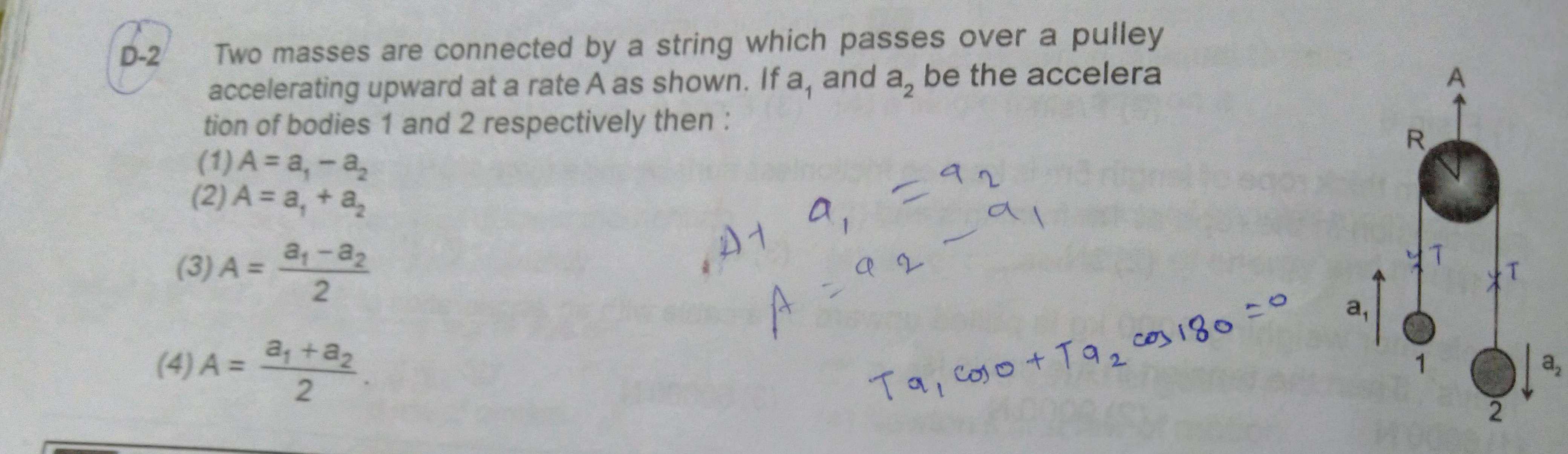Answer is (a1-a2)/2. The negative sign will come because a1 and a2 are in opposite directions. Imagine that string 1 goes down by dx1 distance and string 2 goes down by dx2 distance then the pulley will have to move (dx1+dx2)/2 distance, therefore we divide a1-a2 by 2.