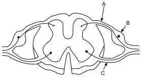 1. A-Afferent fibre, B-Interneuron, C-Sensory fibre